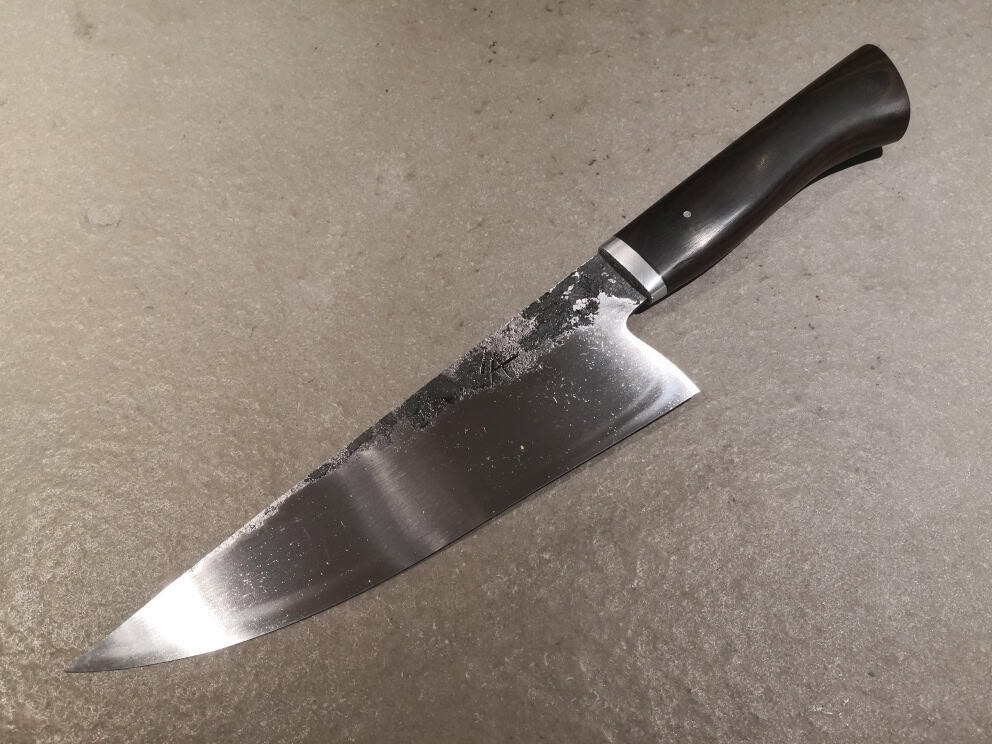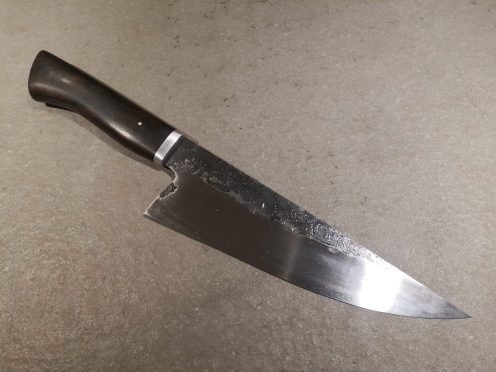 Coltello da chef forgiato in acciaio al carbonio 135Cr3, con manico in ebano di Macassar e guardia in alluminio spazzolato.