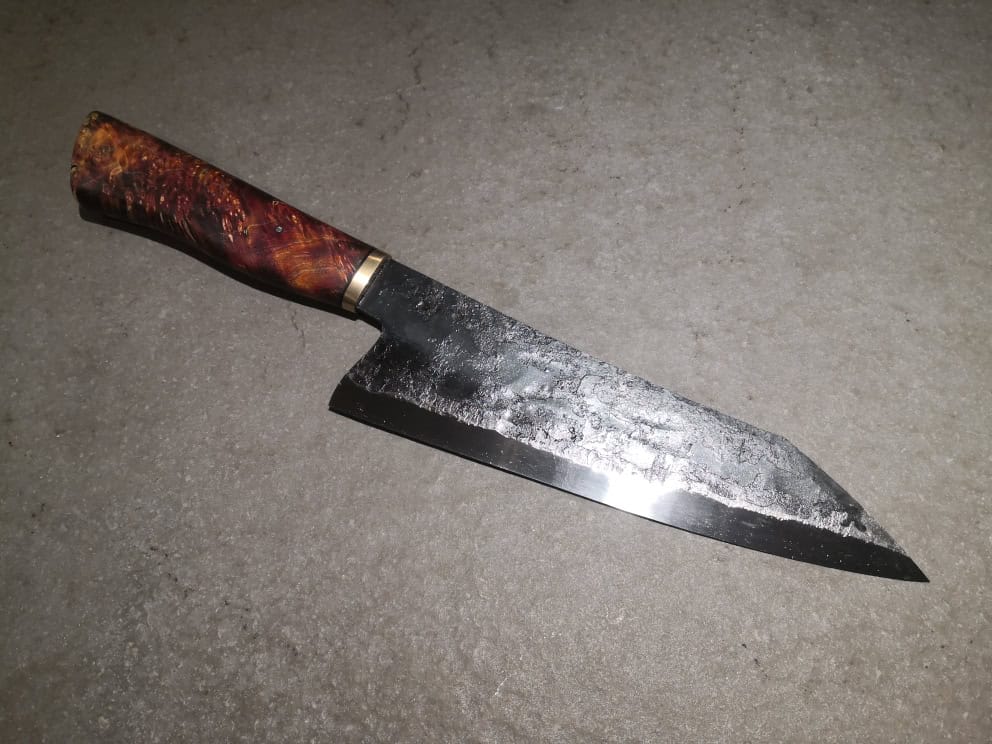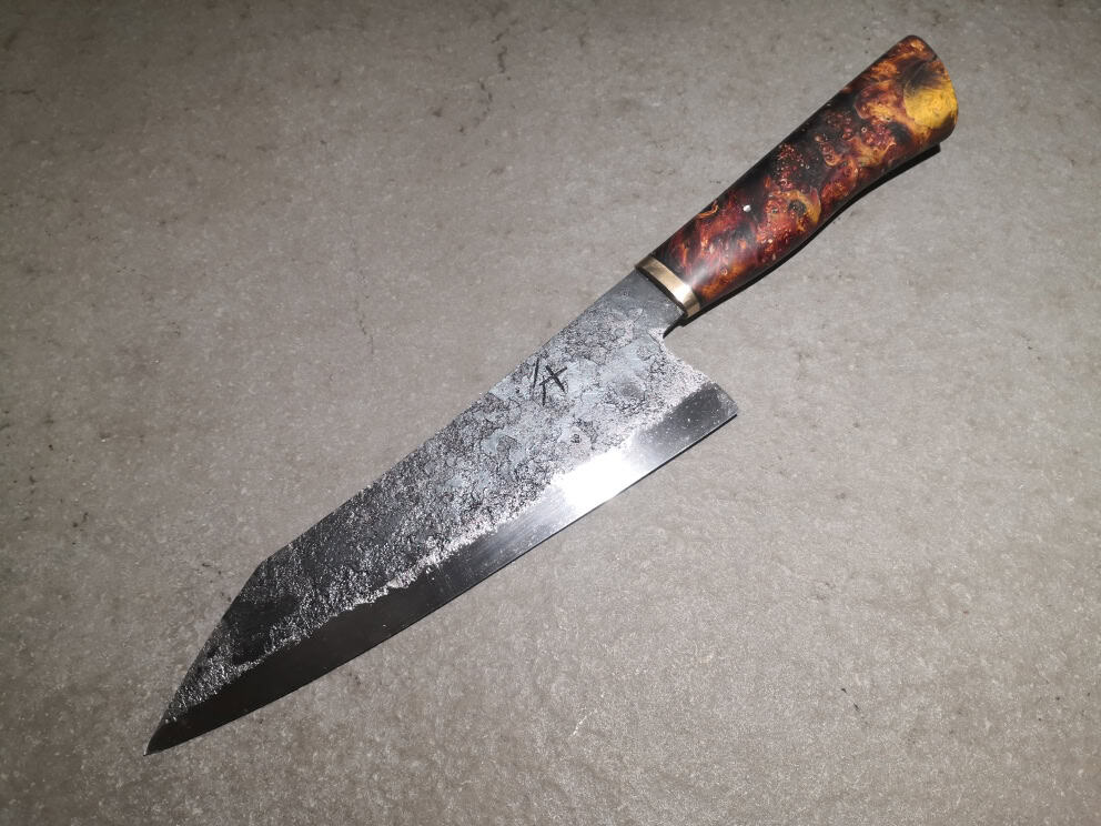 Coltello Gyuto con lama da 210 mm, forgiato in acciaio al carbonio 135Cr3. La lama presenta una finitura di forgiatura volutamente grezza, con bisello lucidato longitudinalmente. Impugnatura ergonomica , realizzata in pregiato legno di radica di sambuco stabilizzato e tinto.