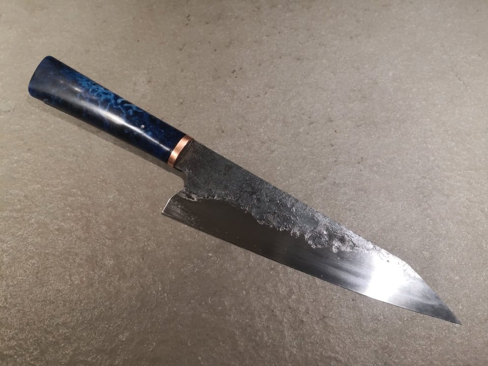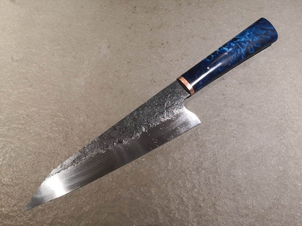 Gyuto forgiato in acciaio al carbonio 13Cr3, con finitura trafilata longitudinalmente. Impugnatura ovale ricavata da un blocco di resina acrilica.