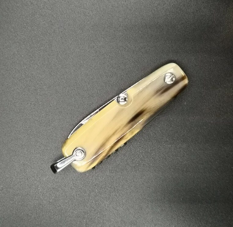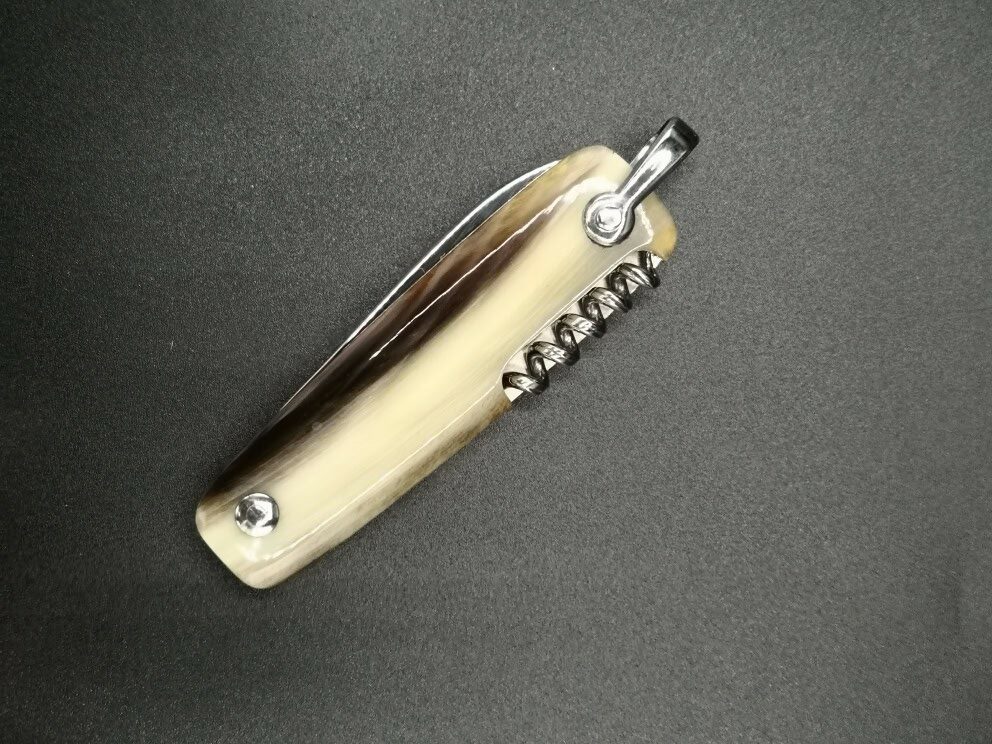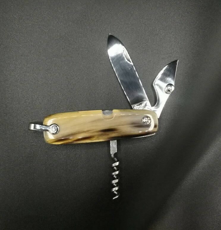 Canif 3 usi con manico in corno di bue. Misura aperto 140 mm.